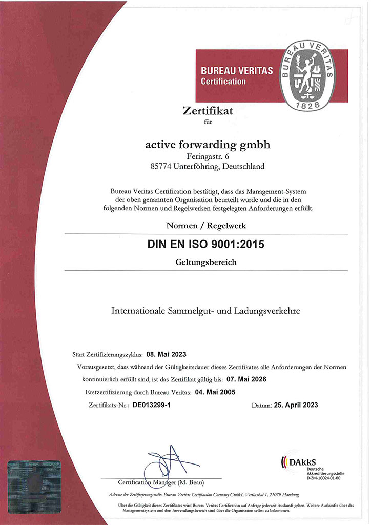 Das Thema Qualität und Sicherheit spielt bei der active forwarding gmbh seit der Gründung im Jahr 2001 eine herausragende Rolle. Bereits seit Mai 2005 ist das Unternehmen nach DIN EN ISO 9001 zertifiziert. Mit dem am 11. März 2011 erfolgreich absolvierten SQAS-Assessment Transport Service und der gleichzeitigen erfolgreichen Rezertifizierung nach DIN EN 9001:2008, demonstriert die active forwarding gmbh die kontinuierliche Weiterentwicklung ihres Qualitäts- und Sicherheitsmanagementsystems.