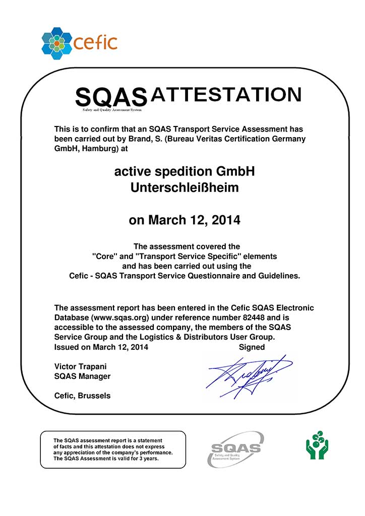 SQAS steht für Safety Quality Assessment Systems und der zugrundeliegende Fragebogen mit seinen rund 400 Fragen zu den Themenbereichen Qualität, Gesundheit, Umwelt und Sicherheit stammt von der CEFIC (European Chemical Industry Council) und wird insbesondere zunehmend von unseren Kunden aus der chemischen Industrie gefordert.Die Ergebnisse können auf der Homepage der CEFIC von deren Mitgliedern eingesehen werden.