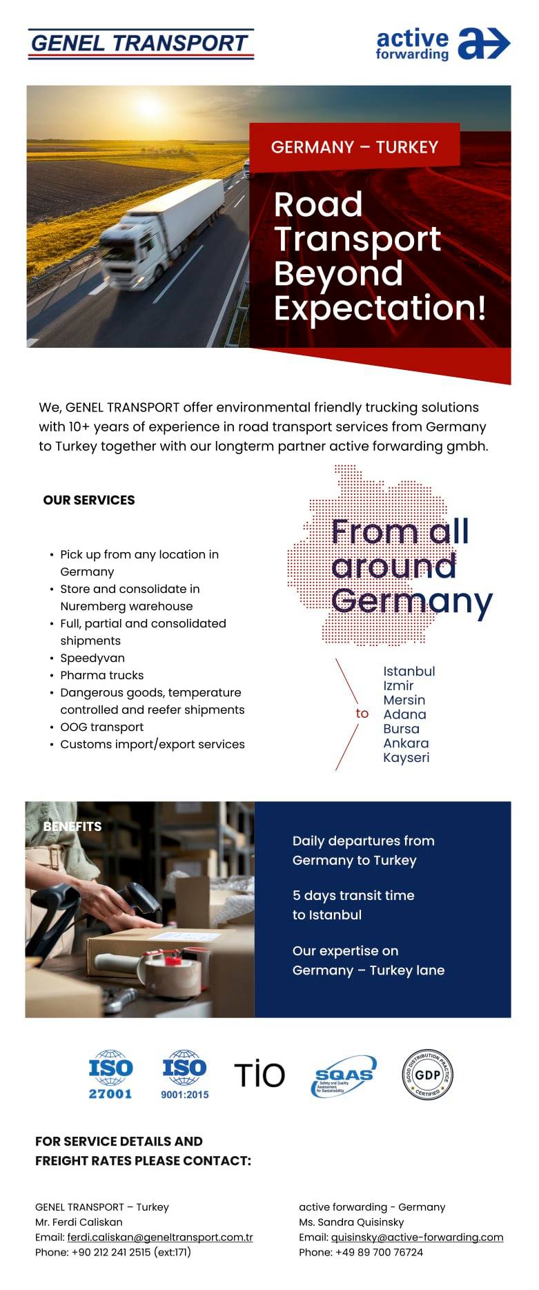 Als langjährige Experten für Transporte aus und in die Türkei verfügen wir über ein kompetentes Netzwerk aus Spezialisten für die unterschiedlichsten Transportaufgaben. Eine exklusive Kooperation für LKW-Verkehre von und in die Türkei unterhalten wir mit GENEL TRANSPORT / Istanbul. Ein erfahrener Frachtführer mit mehr als 10 Jahren praktischer Routine im Straßentransport zwischen Deutschland und der Türkei. Mit einem entsprechenden Spezialfuhrpark steht Ihnen eine Bandbreite an Transportlösungen zur Verfügung. Von regulärem Sammelgut über Expressleistungen, Kühltransporte bis hin zu Gefahrgut und zertifizierten Pharmatransporten.